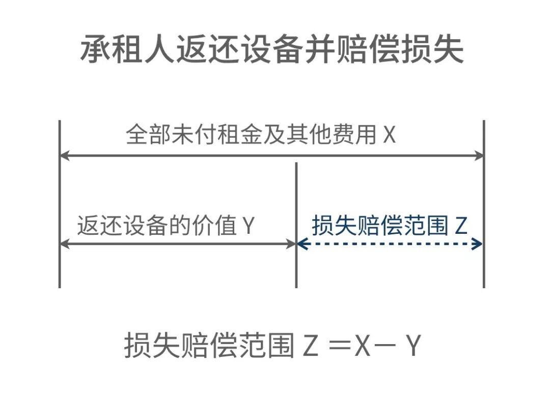 注:当全部未付租金及其他费用小于或等于返还设备的价值时(即X≤Y),承租人不需要承担赔偿责任,甚至在X<Y时,出租人还应将多余的设备价值(即Y-X)返还给承租人,但这两种情形非本文需要讨论的问题。