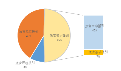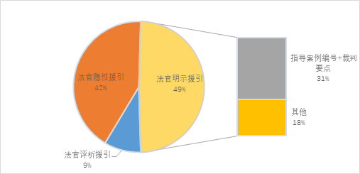 在法官明示援引、法官隐性援引及法官评析援引三种援引方式下,法官采用明示援引的共涉及27例,总体占比为49%,包括法官主动援引的23例和法官被动援引的4例,相比2017年同期(总体占比39%)上升了10个百分点;法官采用隐性援引共涉及23例,总体占比为42%,相比2017年同期(总体占比56%)下降了14个百分点。另外,法官评析援引的应用案例共5例,总体占比约为9%(见图3-8所示)。