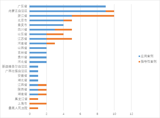 刑事指导性案例主要来源于最高人民法院及浙江省等12个省级行政区域的各级法院,以浙、苏、川等地法院为主。2018年刑事指导性案例的来源地新增内蒙古自治区、湖南省、陕西省及江西省4个省级行政区域的各级法院。应用刑事指导性案例的法院共涉及广东省、内蒙古自治区、北京市、四川省等20个省级行政区域,主要集中在粤、蒙、浙、京、渝等地,2018年应用地域新增河南省、吉林省、湖南省、陕西省4个省级行政区域的各级法院。应用率较高的内蒙古自治区首次遴选出刑事指导性案例;河南省作为刑事指导性案例的来源地首次发现应用案例。