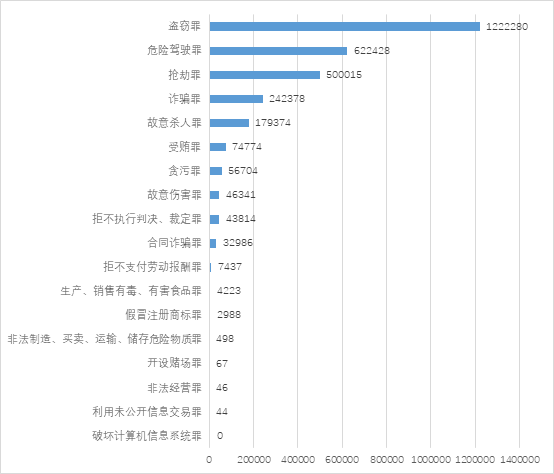 根据2018年12月31日对“北大法宝-司法案例” 的裁判文书查询结果,自各类刑事指导性案例发布以来,与其案由相同的各类案件中,除破坏计算机信息系统罪以外均有审结的情况,尤其是侵犯财产类犯罪,其审结的数量总体占比为了绝对优势。自2014年6月23日发布指导案例27号,2013年1月31日发布指导案例14号以来,截至2018年12月31日,盗窃案已审结1222280例,诈骗案已审结242378例,抢劫案已审结500015例。但是,在如此高的结案量中,参照指导案例27号以及指导案例14号做出的裁判的仅各有1例。2018年发布的第20批5例涉及网络犯罪的指导性案例中,由于发布时间较短导致相同案由的案件较少且并未应用。不过,这从另一个侧面也反映出,指导性案例在同类案件中的司法应用空间还是比较大的(见图3-21所示)。
