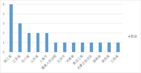 刑事指导性案例主要来源于最高人民法院及浙江省等12个省级行政区域的各级法院。2018年刑事指导性案例的来源地新增内蒙古自治区、湖南省、陕西省及江西省4个省级行政区域的各级法院,分别有1例。其中,浙江省的最多,有5例;其次为江苏省,有3例;四川省、山东省及上海市分别有2例;最高人民法院以及北京市、河南省、黑龙江省的各级法院,分别有1例(见图3-3所示)。