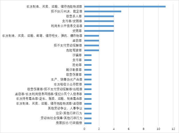 在55例刑事应用案例中,共涉及非法制造、买卖、运输、储存危险物质罪、拒不执行判决、裁定罪等25类案由,与2017年同期(19类)相比增加了6类。指导案例28号(拒不支付劳动报酬罪)首次被应用于同类案由,共有2例。其中,非法制造、买卖、运输、储存危险物质罪仍然最多,共计11例,总体占比为20%;案由为拒不执行判决、裁定罪,有5例,超过贪污罪/受贿罪、故意杀人罪,排名上升至第二位;案由为贪污罪/受贿罪、故意杀人罪、利用未公开信息交易罪、受贿罪各有4例,总体占比分别为7%;案由为危险驾驶罪、拒不支付劳动报酬罪、盗窃罪、非法制造、买卖、运输、邮寄、储存枪支、弹药、爆炸物罪各有2例,总体占比分别为4%;案由为非法吸收公众存款罪、生产、销售伪劣产品罪、故意伤害罪、敲诈勒索罪、抢劫罪、贪污罪、诈骗罪等15类案由,均各有1例。(见图3-9所示)。