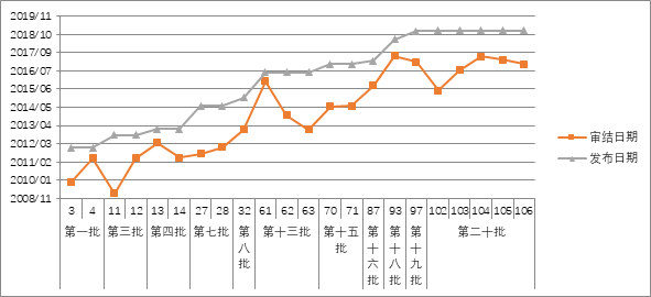 审结日期与发布日期二者间隔在3年之内的案例数量19例,总体占比为86%。间隔时间3年以上案例有3例,即指导案例11号、63号和102号。其中指导案例11号是审结日期最早的案例,审结日期为2009年3月,发布日期为2012年9月,审结日期与发布日期间隔约3.5年。间隔在1年之内的有4例案例,即指导案例4号、13号、61号、93号,发布和审结时间的间隔分别约7个月、10个月、6个月及11个月。审结最早的案例可以追溯到2009年3月的“杨延虎等贪污案”,最新案例的审结时间是2017年6月的“于欢故意伤害案”(见图3-1所示)。