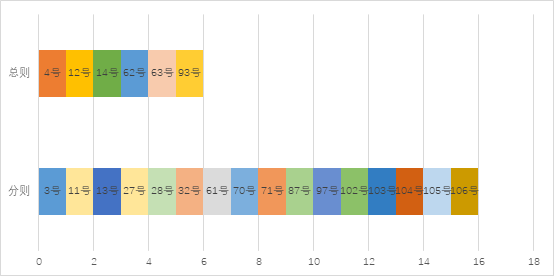 相关法条是刑事指导性案编写结构不可或缺的内容之一。在一篇指导性案例中,相关法条与其裁判要点是相呼应的,裁判要点的总结往往来源于相关法条。22例刑事指导性案例中,有21例裁判要点为实体指引,仅有1例为刑事诉讼程序问题。相关法条涉及刑法总则的有6例,总体占比为27%,具体包括指导案例4号、12号、14号、62号、63号及93号;涉及刑法分则的有16例,总体占比为73%,具体包括指导案例3号、11号、13号、27号、28号、32号、61号、70号、71号、87号、97号、102-106号(见图3-2所示)。