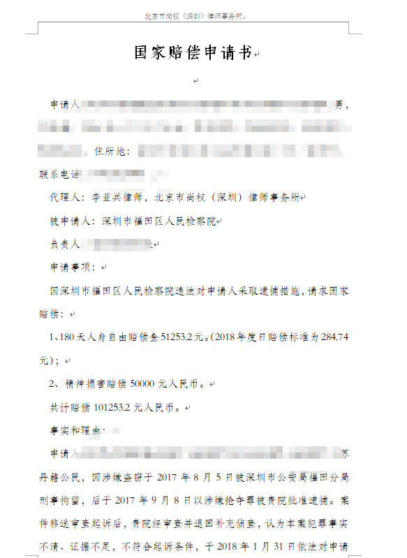 刑事国家赔偿也叫刑事赔偿,是国家赔偿的重要组成部分。刑事赔偿不仅通过赔偿的方式弥补了赔偿请求人在刑事诉讼活动中遭受的损害,而且对我国刑事司法机关及其工作人员的履职行为起着重要的评价与监督职能。由于刑事赔偿的程序和内容较为繁杂,且相对方为国家司法机关,实践中不少适格的赔偿请求人并不重视这一权利,或因为各种原因放弃行使这一权利。因此,本文希望通过笔者办理的外国人A成功申请国家赔偿的案例,分享申请国家赔偿的相关经验。 一、案例 A是外国人,因涉嫌盗窃被深圳市公安局福田分局刑事拘留,后以涉嫌抢夺罪被深圳市福田区人民检察院批准逮捕。笔者介入本案后,经过会见A和查阅案卷材料,认为现有证据不符合起诉的条件,遂提出A不构成犯罪的辩护意见。经多次与承办人员沟通,检察院经退回补充侦查后,认为本案犯罪事实不清、证据不足,于2018年1月31日依法对A作出不起诉决定,并于当日释放。 不起诉决定作出一段时间后,A决定提起国家赔偿申请,并继续委托笔者代理其申请国家赔偿。笔者在收集齐全相关证明材料,撰写国家赔偿申请书后,代A正式向深圳市福田区检察院提起国家赔偿申请。2019年3月18日,深圳市福田检察院经过审查,认为A符合国家赔偿的要求,决定支付A人身自由赔偿金人民币共计51253.20元。 二、国家赔偿的范围 案例中,A因为涉嫌犯罪被采取逮捕措施,后在审查起诉阶段被作出证据不足的不起诉决定,符合刑事赔偿的条件。那么,在刑事案件中,还有哪些情况可以获得国家赔偿呢?笔者根据《中华人民共和国国家赔偿法》等法律、司法解释的相关规定,总结如下: 1、违反刑事诉讼法的规定对公民采取拘留措施的,或者依照刑事诉讼法规定的条件和程序对公民采取拘留措施,但是拘留时间超过刑事诉讼法规定的时限,其后决定撤销案件、不起诉或者判决宣告无罪终止追究刑事责任的。 2、对公民采取逮捕措施后,决定撤销案件、不起诉或者判决宣告无罪终止追究刑事责任的。需要指出,这里的“不起诉”,不包括绝对不起诉(不含没有犯罪事实)、相对不起诉、附条件不起诉以及因刑事和解不起诉这几种不起诉类型。 3、再审改判无罪,原判自由刑、罚金、没收财产已经执行的。 4、违法对财产采取查封、扣押、冻结、追缴等措施的; 5、刑讯逼供或殴打、虐待等行为或者唆使、放纵他人以殴打、虐待等行为造成公民身体伤害或者死亡的。 6、违法使用武器、警械造成公民身体伤害或者死亡的。 在下列情况下,国家不承担赔偿责任: 1、因公民自己故意作虚伪供述,或者伪造其他有罪证据被羁押或者被判处刑罚的。 2、依照刑法第十七条、第十八条规定不负刑事责任的人被羁押的。即,因未达到刑事责任年龄或因精神病而被认定不需承担刑事责任的人,即使被采取了强制措施,国家也不承担赔偿责任; 3、依照现行刑事诉讼法第十六条规定不追究刑事责任的人被羁押的; 4、行使侦查、检察、审判职权的机关以及看守所、监狱管理机关的工作人员与行使职权无关的个人行为; 5、因公民自伤、自残等故意行为致使损害发生的; 6、法律规定的其他情形。 三、赔偿义务机关的确定 确认符合刑事国家赔偿的范围后,下一步就是找到具体求偿的单位,即确定赔偿义务机关。案例中,涉及到的办案单位有深圳市公安局福田分局、深圳市福田检察院两个单位。A的情况属于被逮捕后,检察院决定不起诉,根据《国家赔偿法》的规定,赔偿义务机关则为深圳市福田区检察院。 其他情形下,赔偿义务机关的确定,根据相关法律和司法解释总结如下: 1、对公民采取拘留措施,依照本法的规定应当给予国家赔偿的,作出拘留决定的机关为赔偿义务机关。 2、对公民采取逮捕措施后决定撤销案件、不起诉或者判决宣告无罪的,作出逮捕决定的机关为赔偿义务机关。 3、再审改判无罪的,作出原生效判决的人民法院为赔偿义务机关。二审改判无罪,以及二审发回重审后作无罪处理的,作出一审有罪判决的人民法院为赔偿义务机关。 4、涉及对公民财产的违法处置或对违法行为造成公民人身伤亡的,具体实施违法行为的机关为赔偿义务机关。 四、材料准备 前述赔偿范围和赔偿义务机关的确定属于实体范畴的内容,申请国家赔偿需要落实到具体的每一份材料。案例中,根据申请国家赔偿的规范要求,需要提供以下材料: 1. 国家赔偿申请书(原件); 2、不起诉决定书(收复印件,验原件); 3、释放证明(收复印件,验原件); 4、身份证、护照(外国人)身份证明(收复印件,验原件); 5、委托律师代理,需提供委托手续:所函、律师证复印件、委托书(原件); 6、收款银行卡(复印件,需申请人名下银行卡。外国人如在华无法办理银行卡,需提供情况说明,并出具委托书委托他人代领。) 以上材料一式四份,具体以赔偿义务机关的要求为准。 申请书对赔偿申请十分重要,落笔的重点应放在申请事项和事实理由这两部分。其中,申请事项是申请人所求偿的具体内容,一般包括:人身自由赔偿金、精神损害赔偿等。赔偿义务机关会根据文书中申请事项所列明的申请赔偿金额,来决定赔偿与否或赔偿的金额。以精神损害赔偿为例,虽然并不是每一个国家赔偿案件都会支持这一赔偿事项,但若在申请文书中没有提出,则赔偿义务机关则会直接忽略对这部分赔偿事项的审查。 五、赔偿